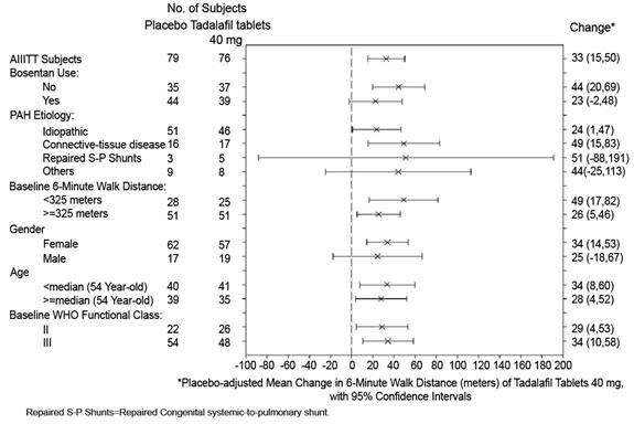 Description: The text provides statistical data related to a study involving subjects who were administered Tadalafil tablets and Placebo. It includes details such as the number of subjects, demographic information like age distribution and gender, and the change in distance walked measured in meters post-medication. Additionally, it includes placebo-adjusted mean change in minute walk distance and confidence intervals for specific metrics like systolic pulmonary pressure. This information appears to be part of a clinical trial evaluation for Tadalafil tablets.*