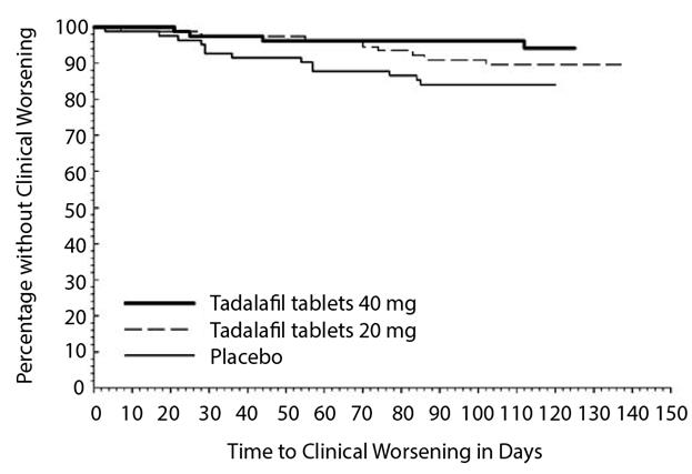 This text appears to be a part of a chart or graph showing the percentage without clinical worsening over time for Tadalafil tablets 40 mg, Tadalafil tablets 20 mg, and Placebo. It also includes a scale of 0 to 150 for time to clinical worsening in days.*