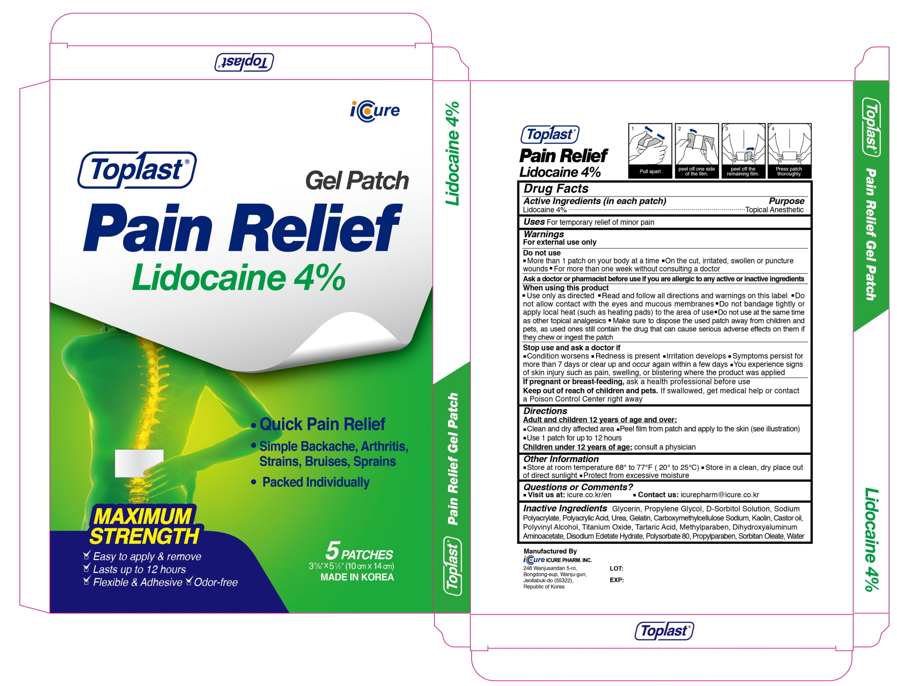 The following image provide visual information about the product associated with Toplast Pain Relief Lidocaine 4percent NDC 73279-0005 by Icure Pharmaceutical Inc, Wanju Factory, such as packaging, labeling, and the appearance of the drug itself. This resource could be helpful for medical professionals, pharmacists, and patients seeking to verify medication information and ensure they have the correct product.