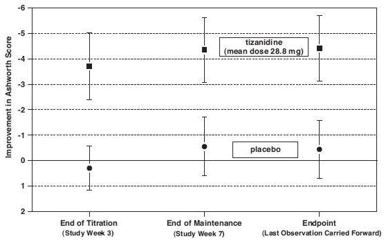 This text appears to be describing the improvement in Ashworth Score with Tizanidine at a mean dose of 26.8 mg compared to a placebo. It mentions different study weeks and the titration and maintenance endpoint for the assessment.*
