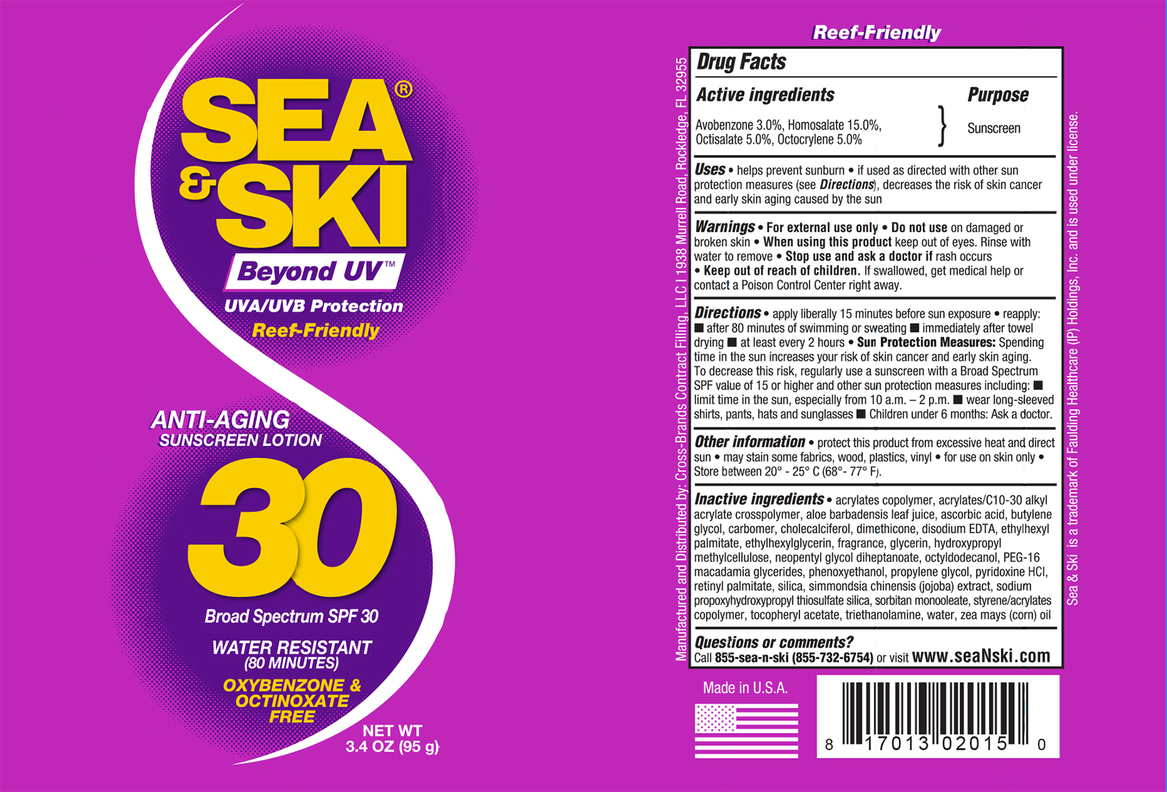This is a Drug Fact related to sun protection lotion of Sea & Ski brand with Broad Spectrum SPF 30 that helps prevent sunburn and decreases the risk of skin cancer and early skin aging caused by the sun. It is water-resistant and reef-friendly. The product is intended for use on skin only and contains active ingredients like avobenzone, homosalate, Octisalate, and Octocrylene. It should be applied liberally 15 minutes before sun exposure and should be reapplied after 80 minutes of swimming or sweating, and at least every 2 hours. This product is only for external use and should be kept out of reach of children. If swallowed, the person should seek medical help or contact a Poison Control Center right away. If rash occurs, the product should not be used, and a doctor should be consulted. The other information related to the product is also mentioned in the text.*