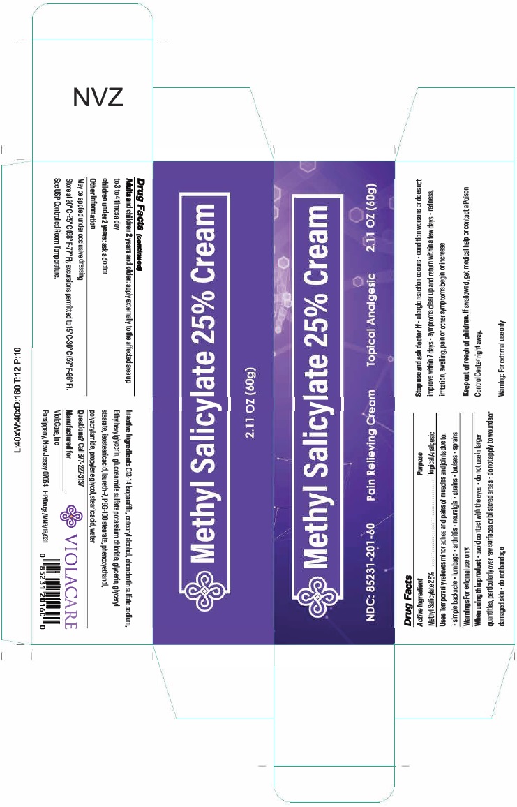 This is a description of Methyl Salicylate 25% Cream, a pain-relieving cream with a topical analgesic property. It is designed to temporarily relieve minor aches and pains in muscles and joints. The active ingredient is Methyl Salicylate at a concentration of 25%. The cream contains various inactive ingredients and has a total weight of 2.11 ounces (60g). The product provides details for contacting the manufacturer in case of any questions. It is advised to keep the cream out of reach of children and to seek medical help if swallowed. The product is manufactured for ViolaCare, Inc. in Parsippany, New Jersey.*