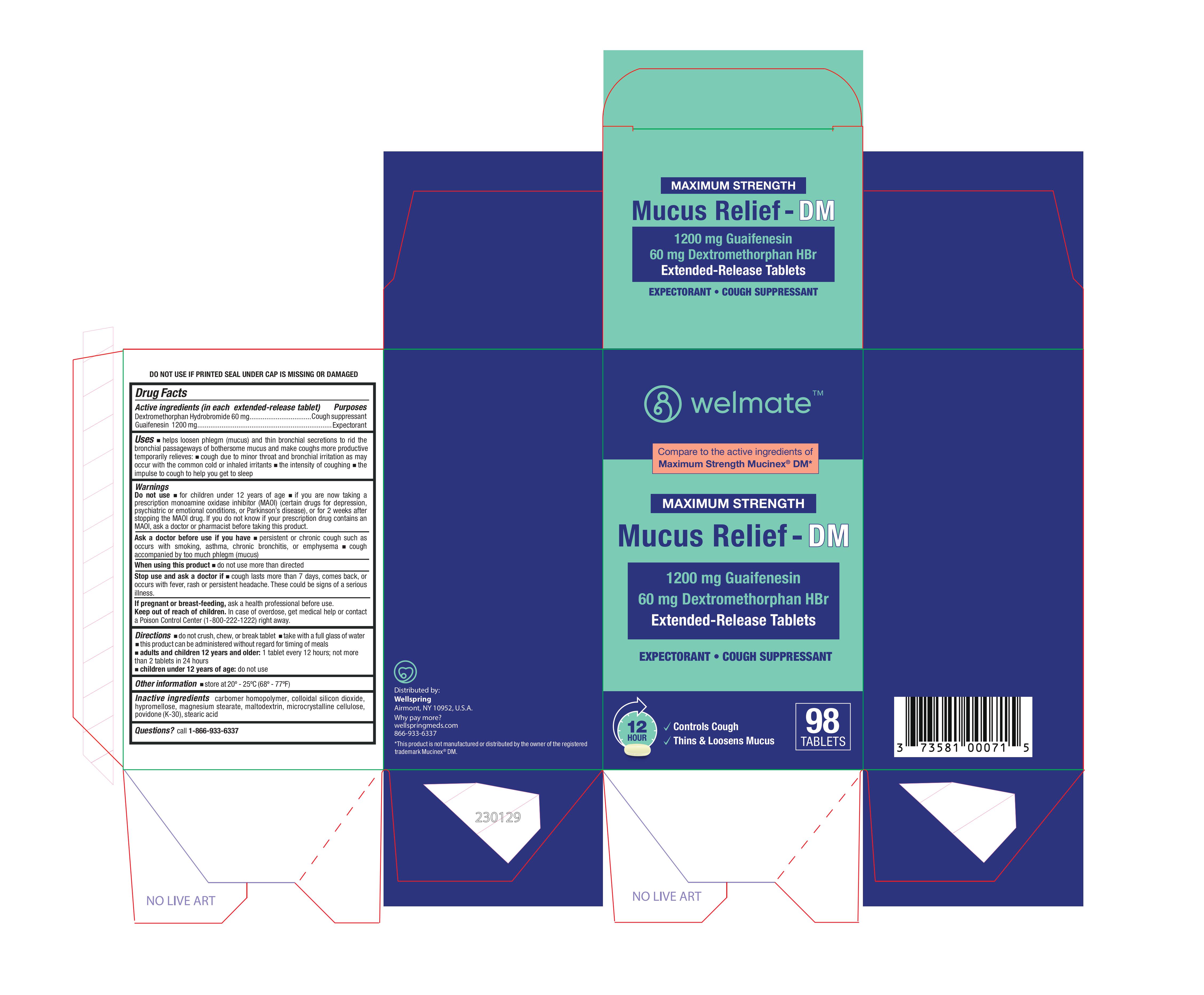 This text is a drug facts label for a medication called Mucus Relief, an expectorant and cough suppressant. It contains 60 mg of Dextromethorphan Hydrobromide and 1200 mg of Guaifenesin per extended-release tablet. The medication is used to help loosen phlegm and thin bronchial secretions to clear the airways. It is indicated for temporary relief of cough due to throat irritation, cold, or inhaled irritants. The label includes warnings not to use for children under 12 years old or if currently taking certain prescription medications. It provides directions for use and storage information.*