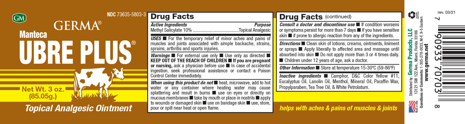 The following image provide visual information about the product associated with Germa Manteca Ubre Plus (yellow) NDC 73635-5803 by Germa Products, Llc, such as packaging, labeling, and the appearance of the drug itself. This resource could be helpful for medical professionals, pharmacists, and patients seeking to verify medication information and ensure they have the correct product.