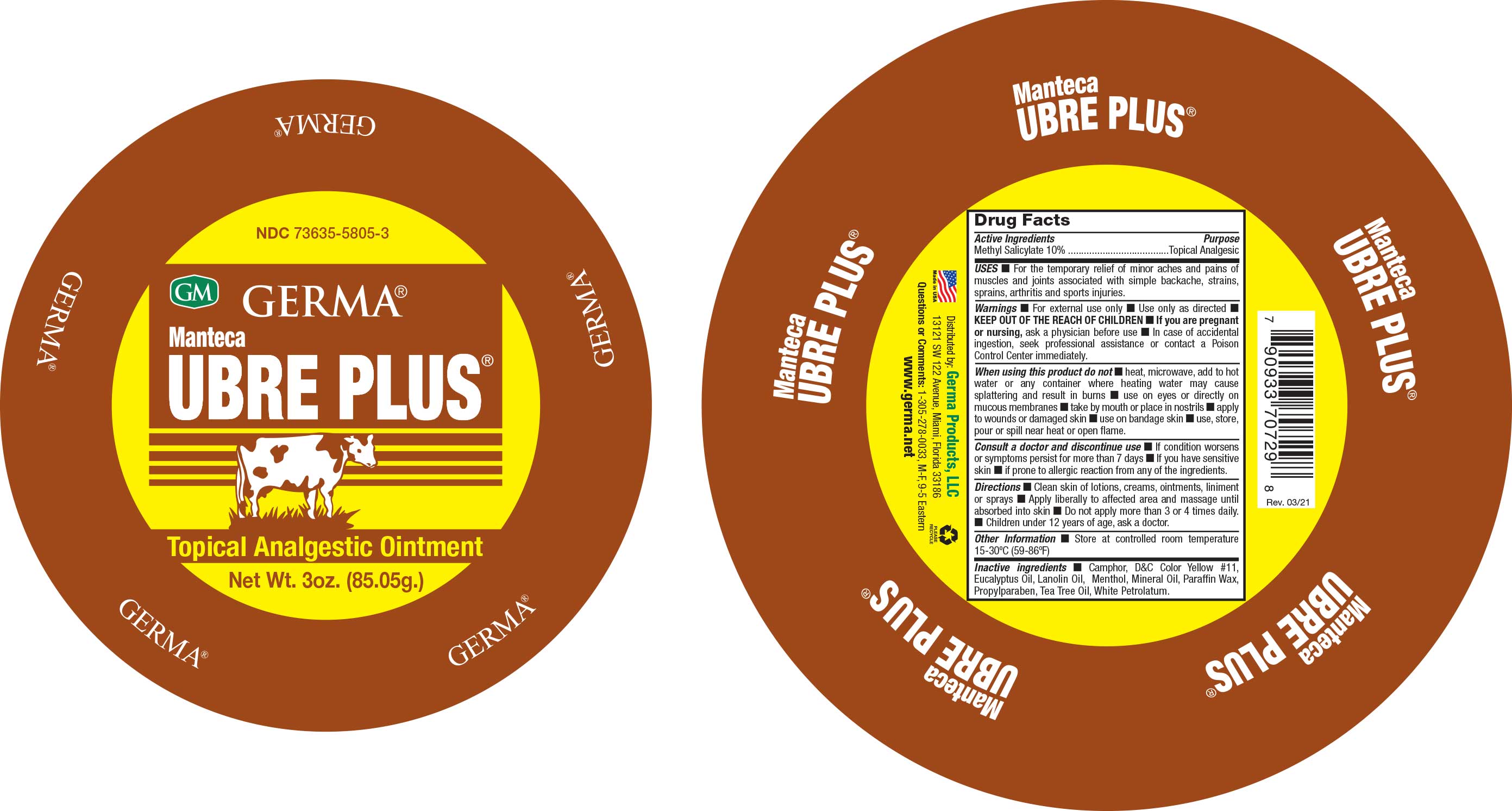 The following image provide visual information about the product associated with Germa Manteca Ubre Plus (tin) NDC 73635-5805 by Germa Products, Llc, such as packaging, labeling, and the appearance of the drug itself. This resource could be helpful for medical professionals, pharmacists, and patients seeking to verify medication information and ensure they have the correct product.