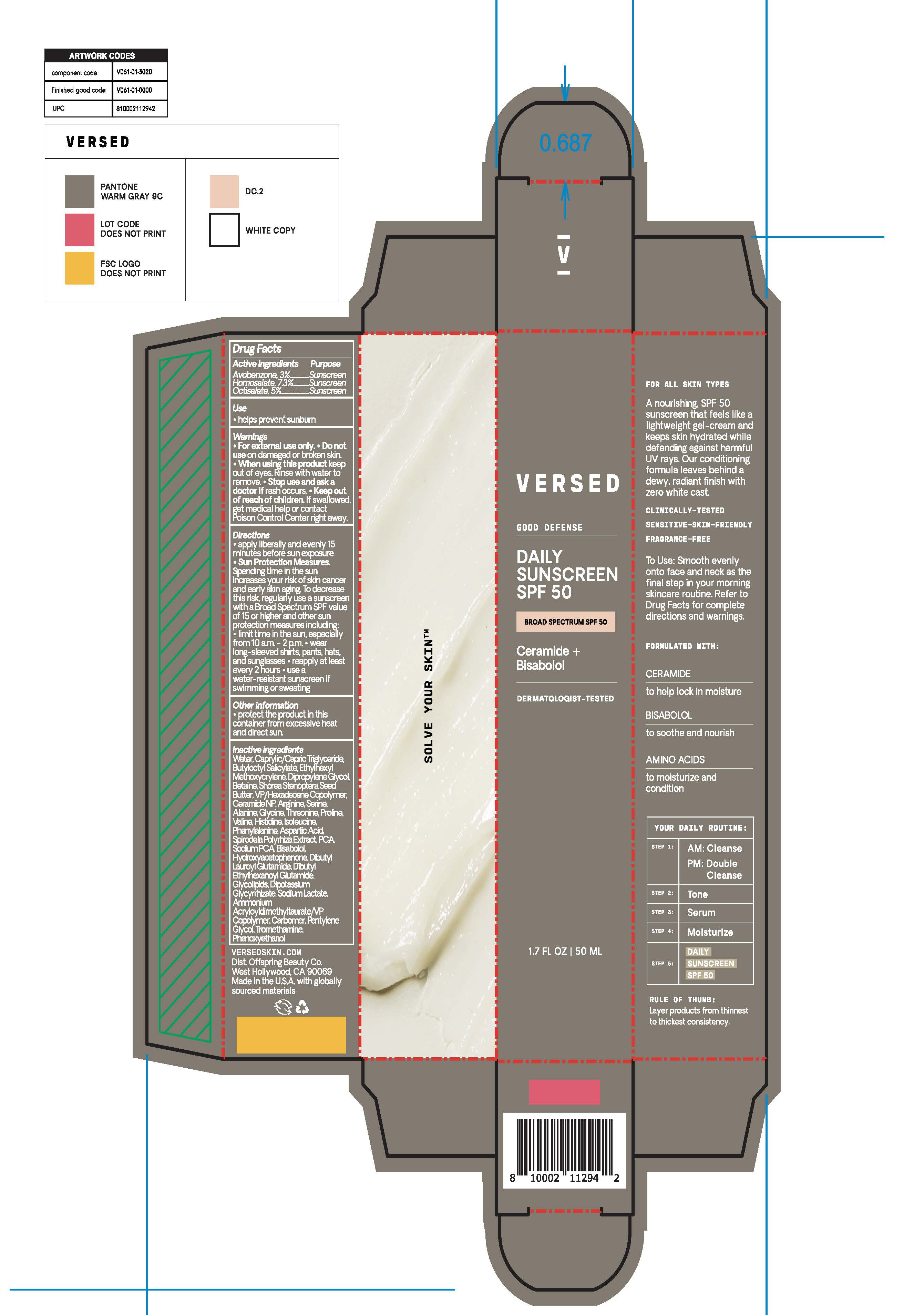 This text appears to be a detailed description of a sunscreen product called "VERSED". The sunscreen is SPF 50 and designed for all skin types. It is described as a nourishing gel-cream that keeps skin hydrated, defends against harmful UV rays, and leaves a radiant finish without a white cast. The product is clinically-tested, fragrance-free, and formulated with ceramides, bisabolol, and amino acids to lock in moisture and soothe the skin. The directions for use include applying liberally and evenly onto face and neck as the final step in a morning skincare routine. Sun protection measures are recommended, including limiting time in the sun, wearing protective clothing, and reapplying sunscreen every 2 hours. The sunscreen is offered in a 1.7 fl oz (50 mL) container and is distributed by Offspring Beauty Co. in West Hollywood, CA, USA. Additionally, there is guidance on layering skincare products from thinnest to thickest consistency.*