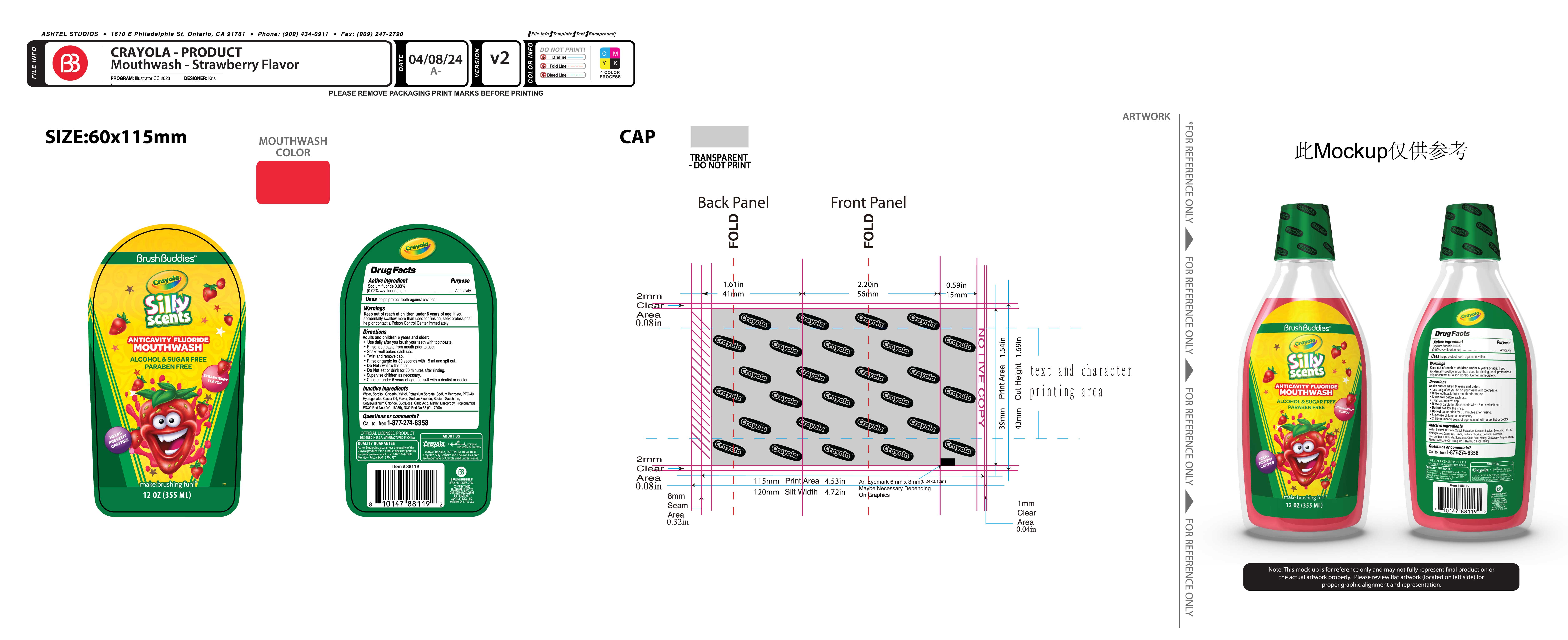 This text provides detailed information about a Crayola Mouthwash in Strawberry Flavor, including its active and inactive ingredients, directions for use, warnings, and product design specifications. It also mentions the manufacturer, features like being alcohol-free and sugar-free, and includes contact information for questions or comments. The text further indicates the importance of supervising children during use and consulting a dentist or doctor for children under 6 years old. Additionally, it emphasizes the quality guarantee and the licensed product status. The description highlights the product's design by ASHTEL STUDIOS and its specifications for packaging and printing.*