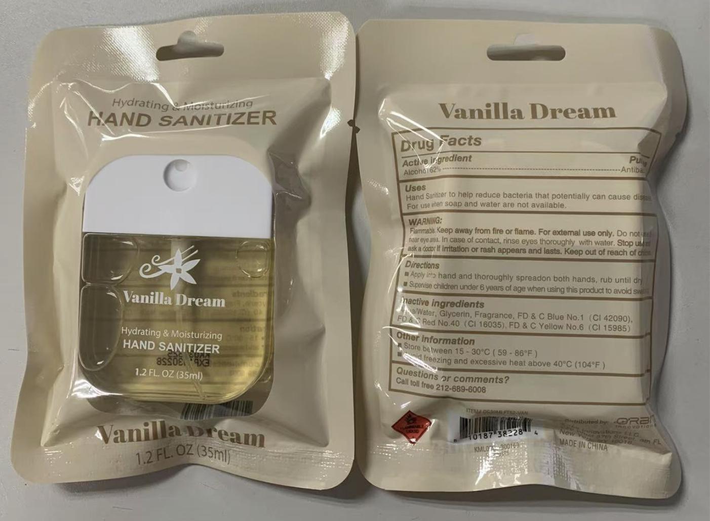 This is a description of a hand sanitizer labeled as "Vanilla Dream". It contains active ingredients to reduce bacteria. The directions instruct to apply to hands and rub until dry. It includes a warning about keeping away from fire, flame, and contact with eyes. The product should be stored between 15-80°C and away from excessive heat above 40°C. For questions or comments, there is a contact mentioned.*