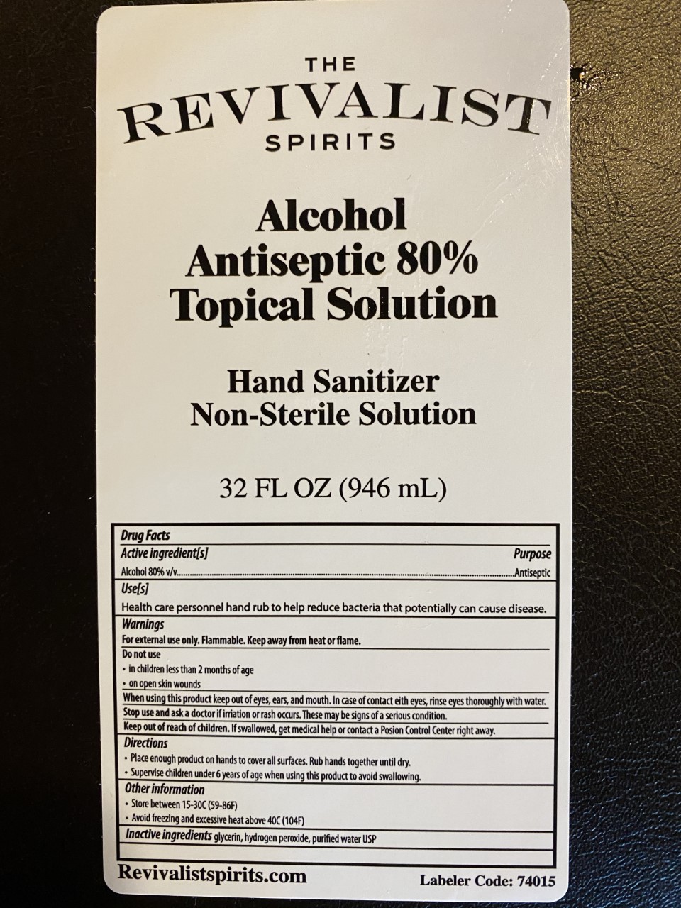 This is a drug fact label for The Revivalist Spirits Alcohol Antiseptic 80% Topical Solution hand sanitizer. It contains 80% alcohol and is intended for use by healthcare personnel to reduce bacteria that could cause disease. The label includes warnings about the product, directions for use, and information about storage and inactive ingredients. It is important to keep the product away from heat or flame and out of reach of children. If swallowed, get medical help or contact a Poison Control Center immediately.*