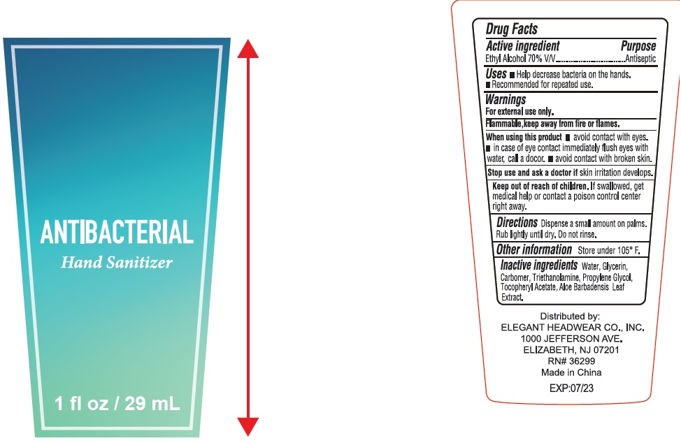 This is a drug facts label for an antibacterial hand sanitizer containing 70% ethyl alcohol. It is intended for repeated use to help reduce bacteria on hands. The label warns that the product is flammable and should be kept away from fire or flames. It is for external use only, and contact with eyes should be avoided. If irritation develops, users should stop using the product and seek medical help. The label also includes information on how to use the product and lists its inactive ingredients. The hand sanitizer is distributed by Elegant Headwear Co., Inc. and was made in China. The product expires in 07/23.*