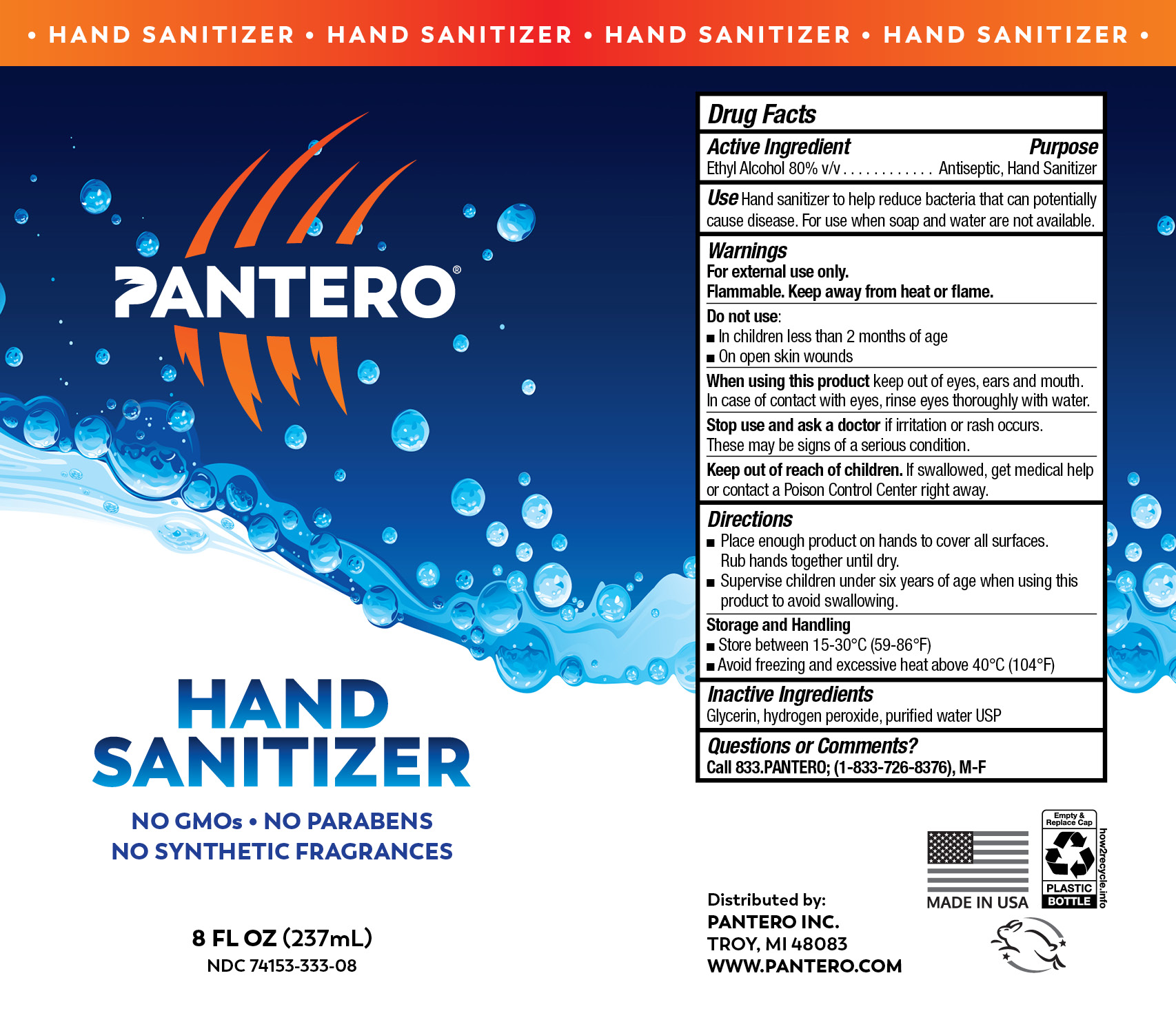 The following 6 images provide visual information about the product associated with Pantero Inc. Hand Sanitizer (80% Ethyl Alcohol) NDC 74153-333 by Pantero, Inc., such as packaging, labeling, and the appearance of the drug itself. This resource could be helpful for medical professionals, pharmacists, and patients seeking to verify medication information and ensure they have the correct product.