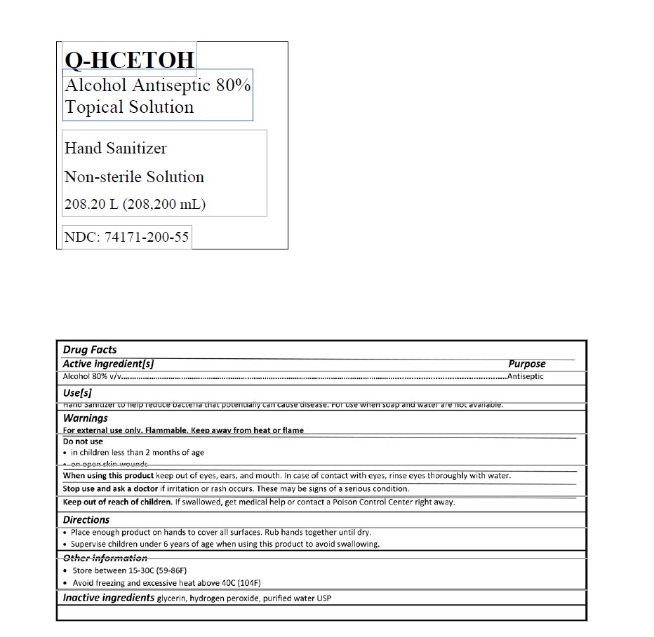 This is a drug fact sheet for Q-HCETOH, a hand sanitizer solution containing 80% alcohol. It comes in a non-sterile solution of 208.20 L (208.200 mL) and has an NDC number of 74171-200-55. It is effective in killing germs and can be used when soap and water are not available. The product contains glycerin, hydrogen peroxide, and purified water as inactive ingredients. The directions for use include placing enough product on hands to cover all surfaces and rubbing hands until dry. Children under 6 should be supervised to avoid swallowing, and the product should be kept away from heat or flames. If swallowed, the user should contact a Poison Control Center immediately.*