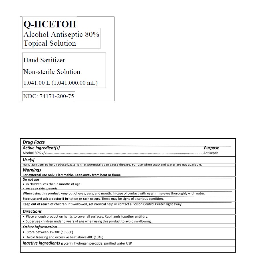 This is a description of a hand sanitizer solution called Q-HCETOH. The solution is a non-sterile solution used as a topical solution to kill potentially harmful bacteria and viruses on hands. It comes in a bottle with a volume of 1.041.00 liters and is identified by the NDC code 74171-200-7. Its active ingredient is alcohol with a concentration level of 80% v/ Antiseptic, and its inactive ingredients include glycerin, hydrogen peroxide, and purified water USP. The product has directions for use as well as warnings such as avoiding contact with the eyes, ears, and mouth, as well as seeking medical help if irritation or rash occurs.*