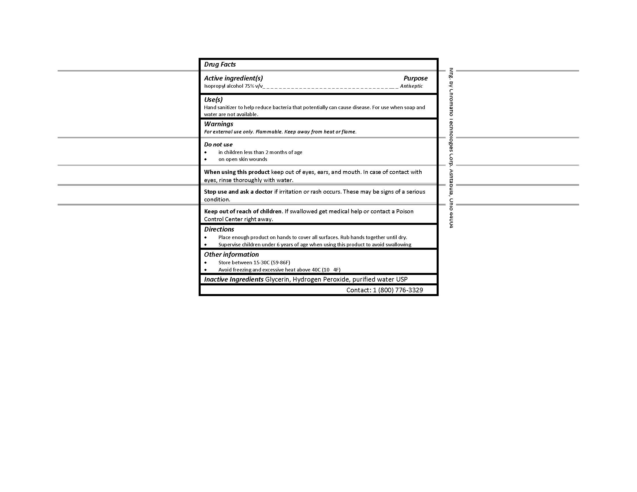 This is a drug fact label for a hand sanitizer containing antiseptic as an active ingredient. Its purpose is to reduce bacteria that can cause disease when soap and water are not available. The label contains warnings indicating that it is flammable and should be kept away from heat or flames. It cannot be used on open skin wounds and in children under 2 months of age. The product should be kept out of eyes, ears, and mouth. The label further instructs to rub hands together until dry after applying enough product to cover all the surfaces. The sanitizer should be kept between 15-30C (59-86F) and should be avoided to freeze or reach excessive heat above 40C (104F). The hand sanitizer contains glycerin, hydrogen peroxide, and purified water USP as inactive ingredients. One can contact 1 (800) 776-3329 for more information.*