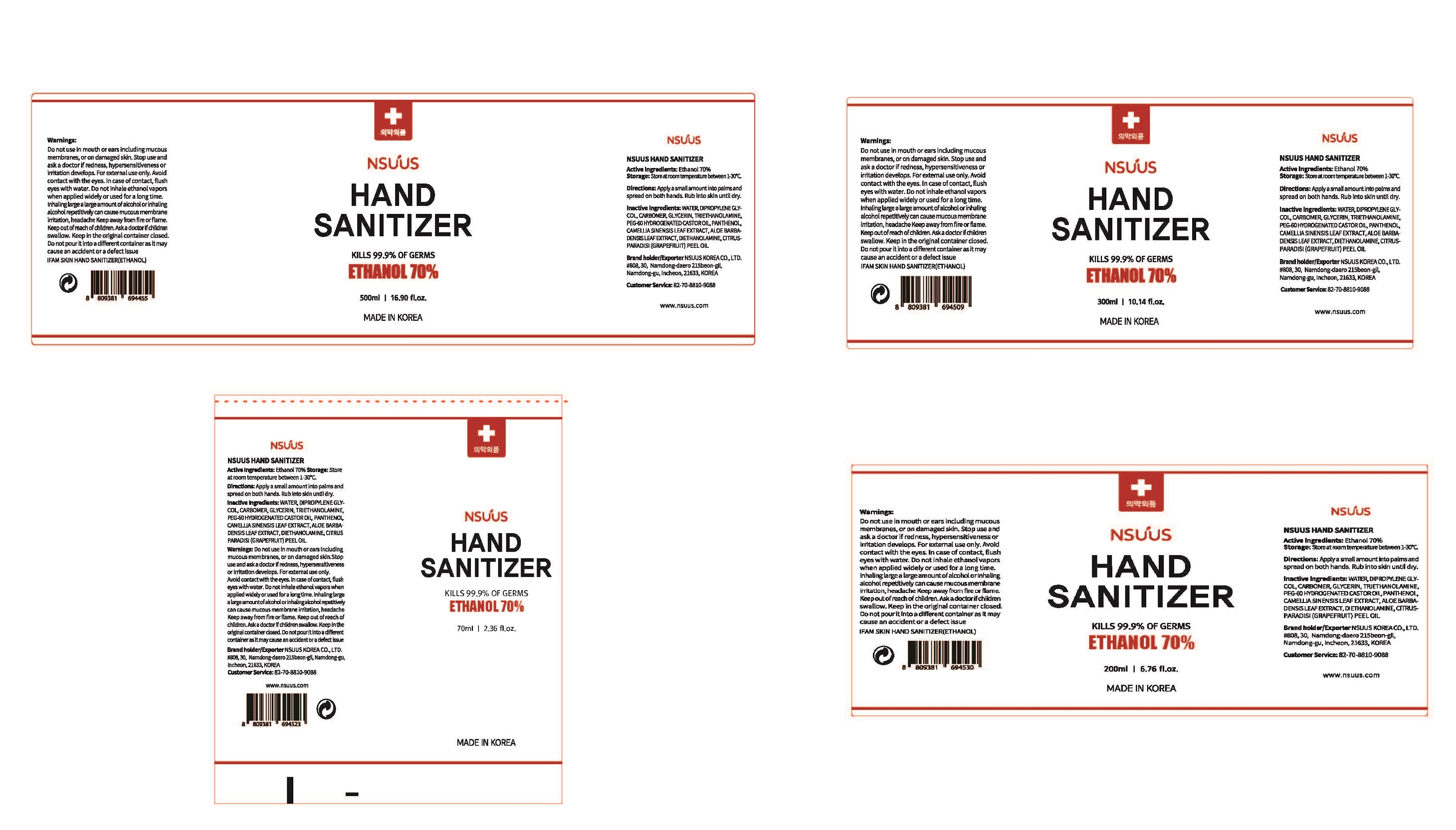 NSUUS HAND SANITIZER is a Korean made product that helps to kill 99.9% of germs to ensure your hands stay clean and hygienic, available in four sizes (70ml, 200ml, 300ml, and 500ml). It contains Ethanol 70% and inactive ingredients include water, Dipropylene Glycol, Carbomer, Glycerin, Triethanolamine, PEG-60 Hydrogenated Castor Oil, Panthenol, Camellia Sinensis Leaf Extract, Aloe Barbadensis Leaf Extract, Diethanolamine, and Citrus Paradisi (Grapefruit) Peel Oil. The product comes with warnings to not use it in mouth, ears, and damaged skin, to avoid contact with eyes, to keep away from fire or flame, and to keep it out of reach of children. If a child swallows it, one should consult a doctor, and it should not be poured into a different container.*