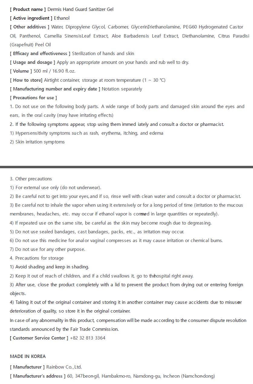 The following image provide visual information about the product associated with Dermis Hand Guard Sanitizer Gel NDC 74247-0010 by Rainbow Co Ltd, such as packaging, labeling, and the appearance of the drug itself. This resource could be helpful for medical professionals, pharmacists, and patients seeking to verify medication information and ensure they have the correct product.