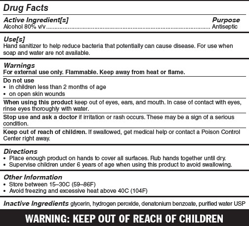 This is a Hand Sanitizer solution, which contains 80% Alcohol Antiseptic and comes in an 8 FL OZ bottle. It is expected to reduce bacteria which can potentially cause disease when soap and water are unavailable. However, it should not be used on children under 2 months of age and open skin wounds. If the sanitizer comes in contact with eyes, rinse eyes thoroughly with water. It is advisable to discontinue use and seek medical attention if irritation or rash occurs. The Hand Sanitizer should be stored between 15-30°C (58-86°F) and out of reach of children. The inactive ingredients in this solution include glycerin, hydrogen peroxide, denatured ethanol, carbomer, and purified water.*