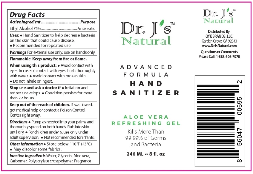 This is a hand sanitizer called Dr. J's Natural Advanced Formula Hand Sanitizer with Aloe Vera Refreshing Gel. It contains 75% Ethyl Alcohol and its main function is to decrease bacteria on the skin that could cause diseases. It warns that it is flammable and should be kept away from fire or flames. It should only be used externally and not inhaled or ingested. It gives directions on how to use it and warns that it not recommended for infants. It also provides information about its inactive ingredients and how to store it. It comes in a 300ml (10 fl. oz) container.*