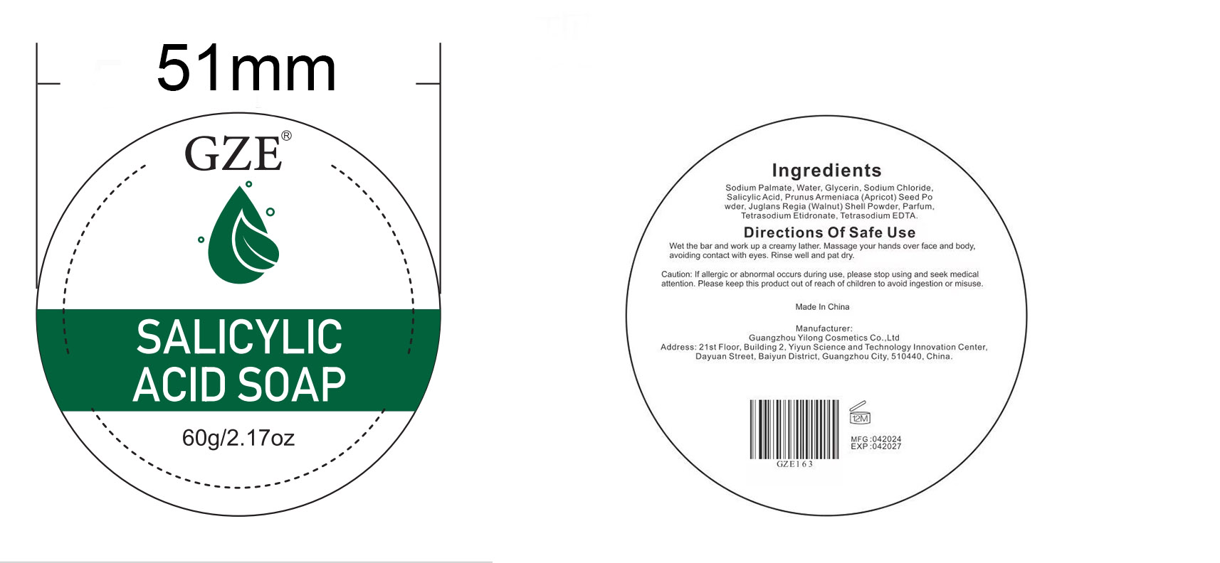 The following image provide visual information about the product associated with Gze Salicylic Acidsoap NDC 74458-163 by Guangzhou Yilong Cosmetics Co., Ltd, such as packaging, labeling, and the appearance of the drug itself. This resource could be helpful for medical professionals, pharmacists, and patients seeking to verify medication information and ensure they have the correct product.