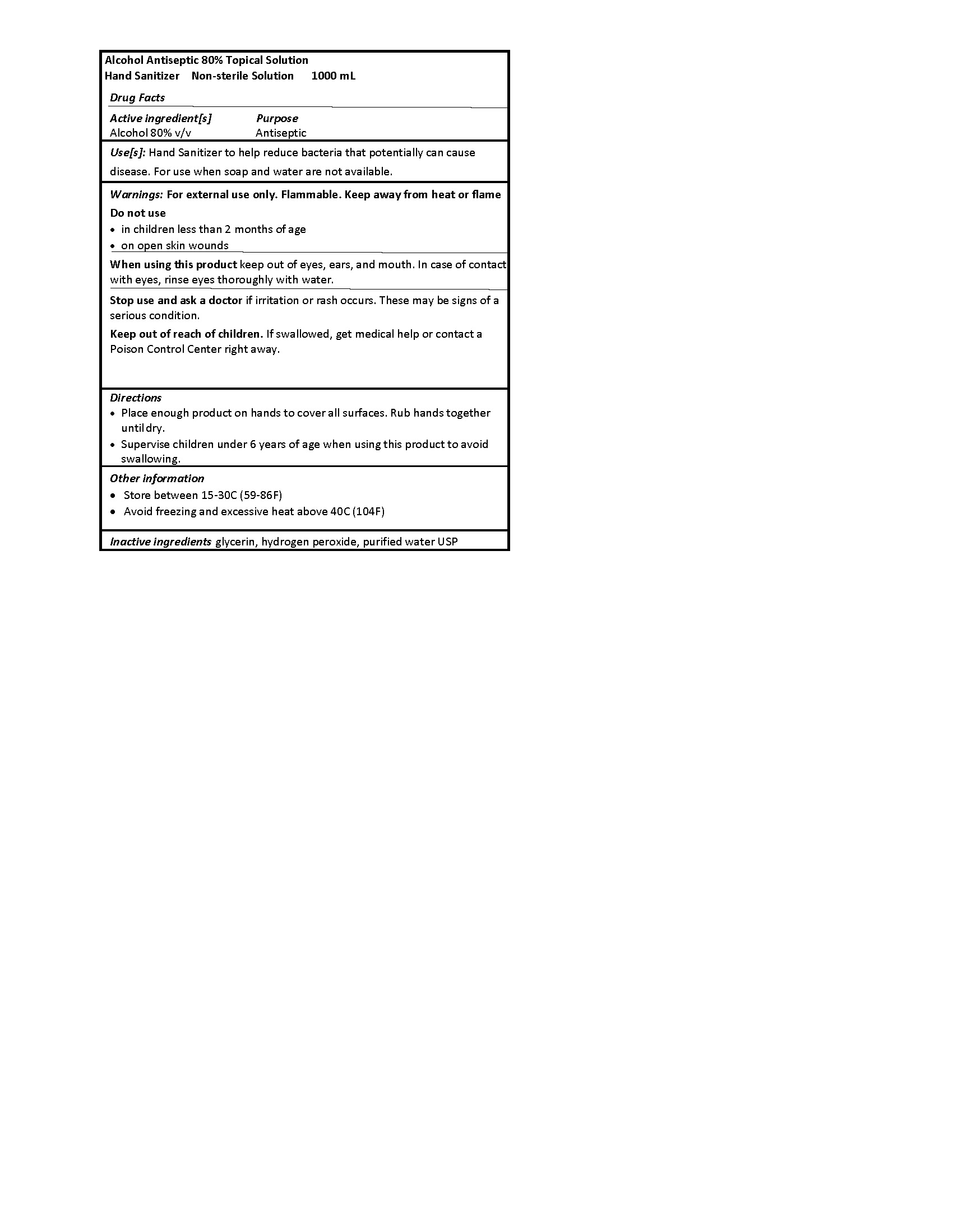 This is a drug facts label for a hand sanitizer solution containing 80% alcohol. It is recommended for external use to kill germs and bacteria on hands. The product should be kept out of eyes, ears, and mouth and should not be used on open skin wounds. If irritation or a rash occurs, medical help should be sought. The product should be kept out of reach of children and if swallowed, medical help or contacting a Poison Control Center should be done immediately. The hand sanitizer should be applied to hands and rubbed together until dry. The solution should be stored at a temperature between 15-30C (59-86F) and should not be frozen or heated above 40C (104F).*
