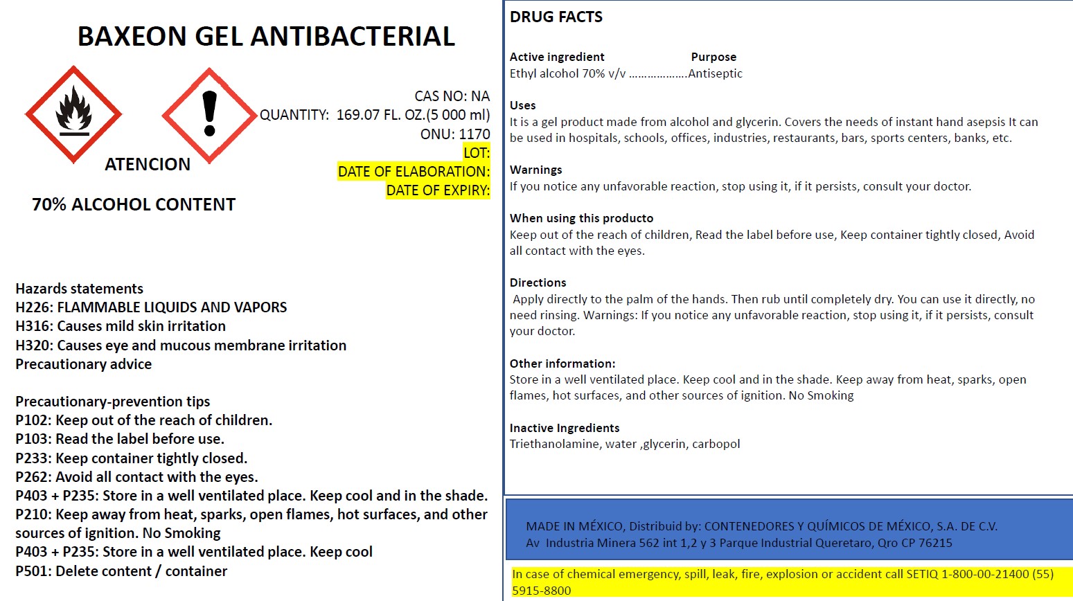 BAXEON GEL ANTIBACTERIAL is an antiseptic solution that contains 70% ethyl alcohol. This solution is suitable for instant hand asepsis and can be used in various settings, including hospitals, schools, industries, and sports centers. It is easy to use and dries quickly without the need for rinsing. However, it must be kept away from the eyes and out of reach of children. The product comes with a set of precautionary measures, including storing it in a cool, well-ventilated place and away from sources of ignition. In case of an unfavorable reaction, users should stop using the product and consult a doctor.*