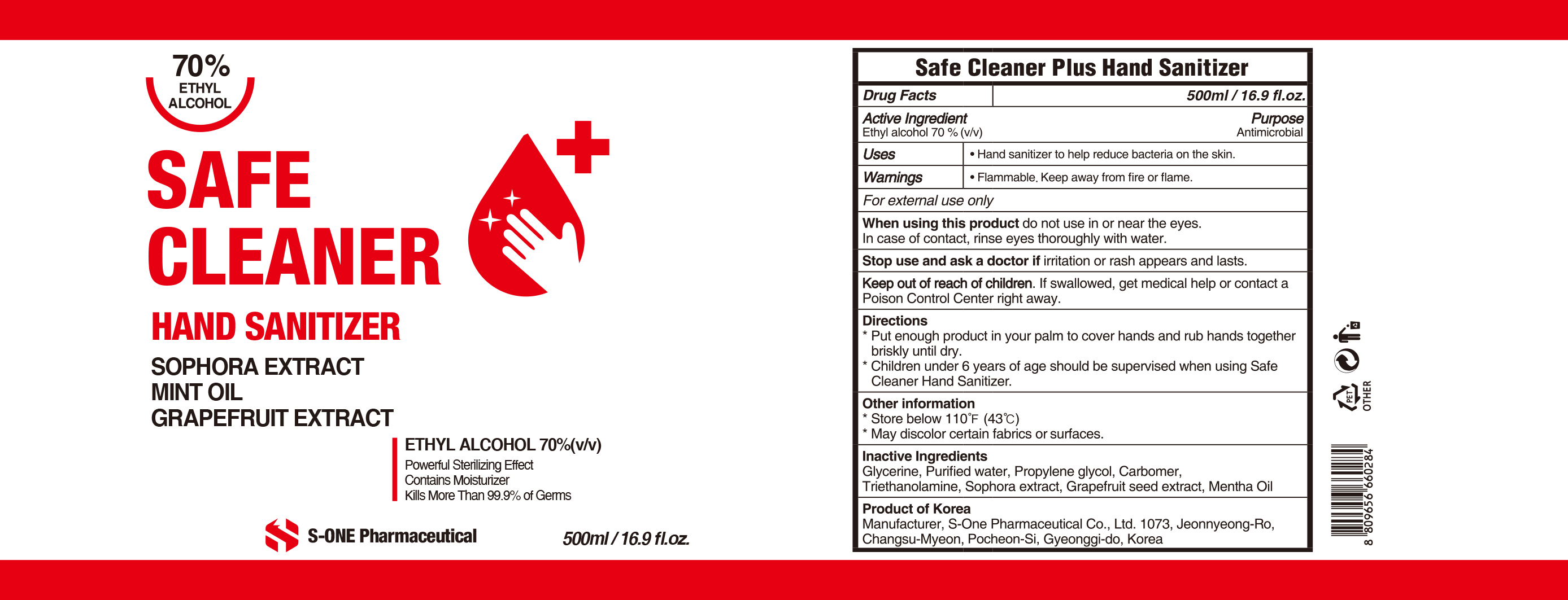 Safe Cleaner Plus Hand Sanitizer is a powerful and safe sterilizing solution that contains 70% (v/v) ethyl alcohol along with Sophora extract, mint oil, and grapefruit extract. This sanitizer comes with a moisturizer and kills over 99.9% of germs. It is accompanied by warnings and directions for its use, like its flammability, external/supervised use, and storage conditions. Safe Cleaner Plus Hand Sanitizer is manufactured by S-One Pharmaceutical in Korea and comes in a 475ml/16.06 fl.oz bottle.*