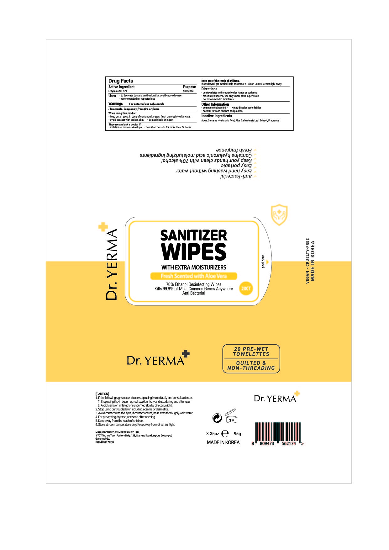 The following image provide visual information about the product associated with Dr. Yerma Sanitizer Wipes Fresh Scented With Aloe Vera NDC 74741-0021 by Mprbrain Co.ltd, such as packaging, labeling, and the appearance of the drug itself. This resource could be helpful for medical professionals, pharmacists, and patients seeking to verify medication information and ensure they have the correct product.