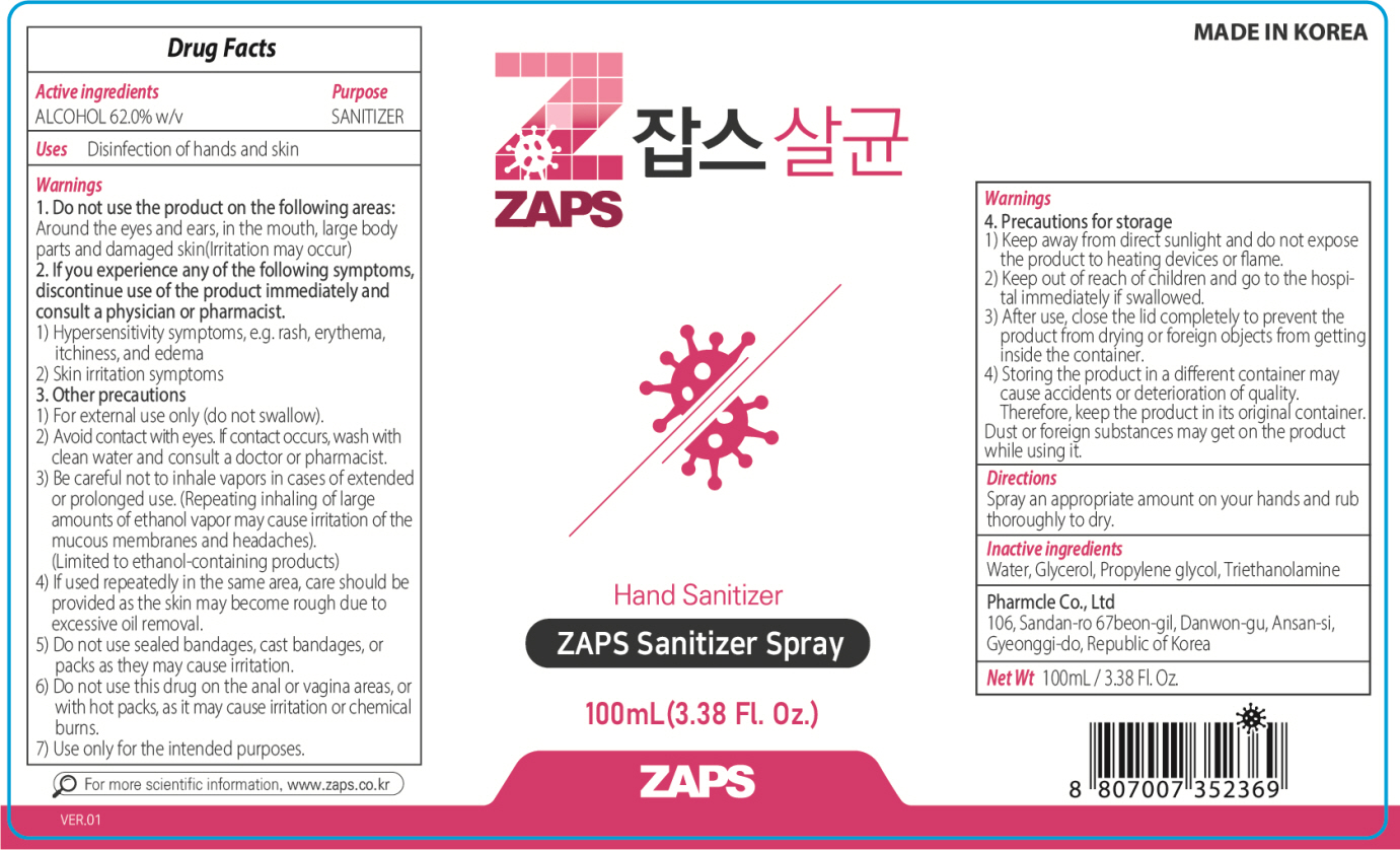 This is a description of a hand sanitizer from Zaps Co. It contains 62% alcohol and is designed to disinfect hands and skin. The active ingredient is ethanol, and the inactive ingredients include water, glycerol, propylene glycol, and triethanolamine. It is recommended not to use this on sensitive areas and damaged skin, and it should be kept away from direct sunlight and heating devices. The product should also not be swallowed and should only be used externally. The product should be kept in its original container, as storing the product in a different container may cause accidents or deterioration of quality. The bottle contains 100 mL of hand sanitizer, and the company is located in South Korea.*