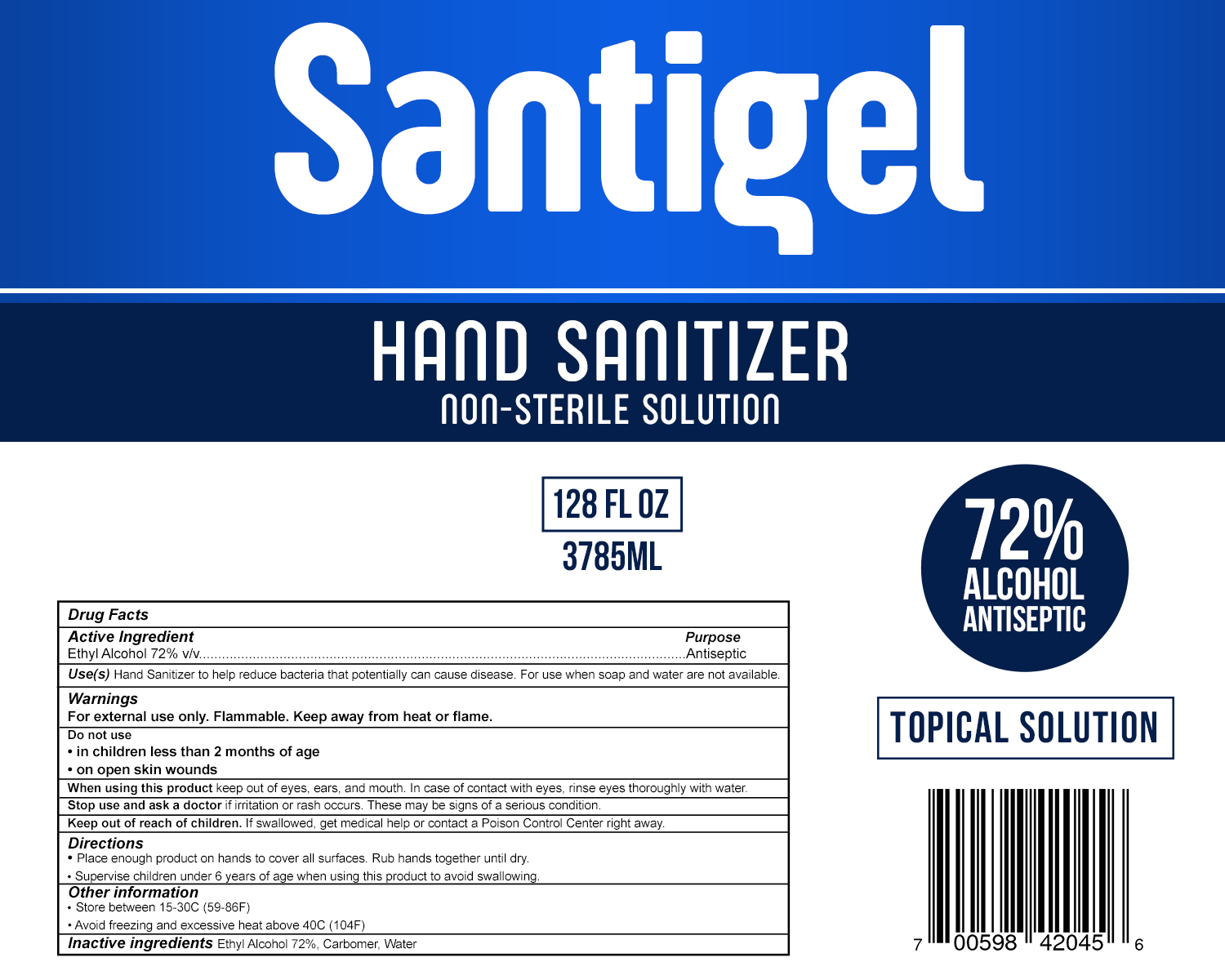 This is a non-sterile solution hand sanitizer containing 72% ethyl alcohol, an antiseptic that helps reduce bacteria that potentially can cause disease. It comes in a large 128 FL0Z (3785ML) bottle with directions to place enough product on hands to cover all surfaces and rub hands together until dry. The product is flammable and shouldn't be used on open skin wounds, in children less than two months old or in eyes, ears, and mouth. It should also be kept out of reach of children and stored between 15-30C (59-86F) without freezing or excessive heat above 40C (104F).*
