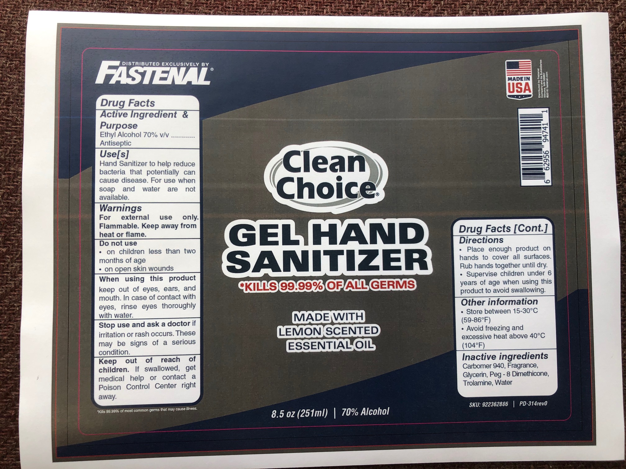 This is a 8 FL OZ (236ml) bottle of hand sanitizer with 70% Ethyl Alcohol used as an antiseptic. The product is used to reduce bacteria that can cause disease when soap and water are not available. It is flammable and should be kept away from heat or flame. The hand sanitizer should not be used on children under two months old or on open skin wounds. If the product comes in contact with the eyes, rinse thoroughly with water. If irritation or rash occurs, stop use and seek medical attention. The product should be kept out of reach of children and if swallowed, medical help should be sought immediately. To use, the user should place enough product on their hands to cover all surfaces and rub until dry. The product should be stored between 15-30°C (59-86°F) and should not be frozen or exposed to excessive heat (>40°C or 104°F). The product contains Carbomer 940, Fragrance, Glycerin, Peg-8 Dimethicone, Trolamine, and Water as inactive ingredients. Finally, the product is distributed under the Fastenal SKU: 922362886 and PD-324Brev.*