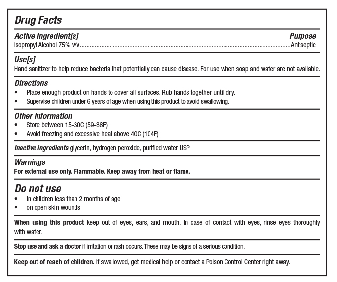 This is a Drug Facts label of a hand sanitizer containing 75% isopropyl alcohol to help reduce bacteria that can cause disease. This hand sanitizer should only be used when soap and water are not available. Apply enough product on hands to cover all surfaces and rub hands together until dry. Children under 6 years old should be supervised to avoid swallowing. The hand sanitizer has glycerin, hydrogen peroxide, and purified water as inactive ingredients. It should be stored between 15-30C, should not be frozen, and should not be exposed to heat above 40C. This product is for external use only, and flammable, so it should be kept away from heat or flame. The hand sanitizer should not be used on children less than 2 months of age, and not be used on open skin wounds. If accidentally contacted to eyes, rinse eyes thoroughly with water. Stop using the product and ask a doctor if irritation or rash occurs. Keep this product out of reach of children, and if swallowed, contact a Poison Control Center or seek medical help immediately.*