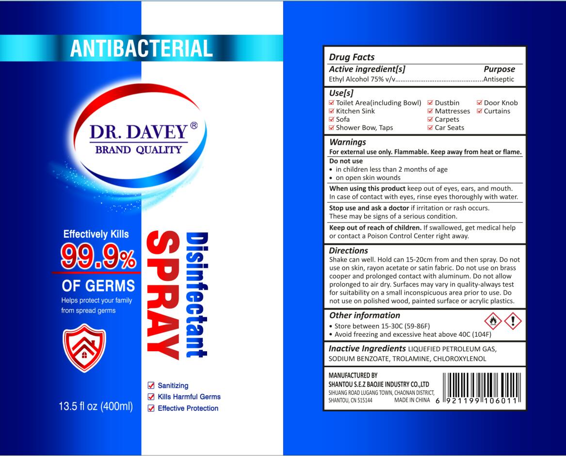 DR. DAVEY® is a brand that offers a sanitizing spray which contains an active ingredient of Ethyl Alcohol (75% V/v) that helps in killing harmful germs, protecting your family from the spread of germs. The product is effective in disinfecting various surfaces such as toilets, dustbins, door knobs, kitchen sinks, mattresses, curtains, sofas, carpets, and car seats. The instructions include shaking the can well, holding it 15-20cm away from the surface, and then spraying. The product comes with a warning label to keep it away from heat or flame, external use only, and not to use it on open skin wounds or children under two months of age. If irritation or rash occurs, discontinue the use of the product immediately. However, it is safe to store the product between 15-30C (59-86F) and away from excessive heat or freezing. Other inactive ingredients include sodium benzoate, trolamine, chloroxylenol, and liquefied petroleum gas. The product is manufactured by SHANTOU S.£.2 BAOJIE INDUSTRY CO, LTD, and made in China.*