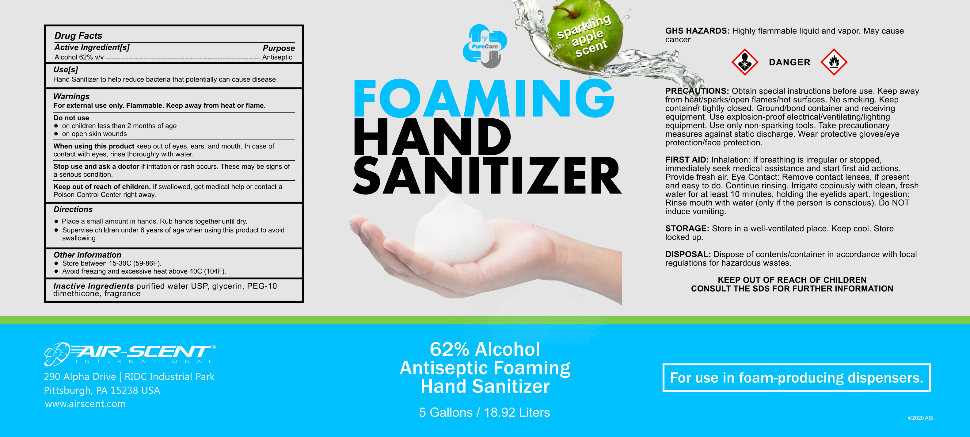 This is a Drug Facts label for an Antiseptic Foaming Hand Sanitizer containing 62% alcohol to help reduce bacteria that can cause disease. The label warns that the product is flammable and should be kept away from heat or flames. It should not be used on children less than 2 months old or on open skin wounds. The user should avoid contact with eyes, ears, and mouth. If contact occurs with eyes, rinse thoroughly with water. The product should be kept out of reach of children and in case of swallowing, medical help or Poison Control Center should be contacted immediately. The sanitizer comes in a 5-gallon bucket with storage directions to keep it between 15-30C and to avoid freezing and excessive heat above 40C. Inactive ingredients include purified water USP, glycerin, PEG-10 dimethicone, and fragrance. The sanitizer's manufacturer is Air-Scent International, based in Pittsburgh, PA. The label also includes information on GHS hazards and precautions, first aid, storage, and disposal, and recommends consulting the SDS for further information.*