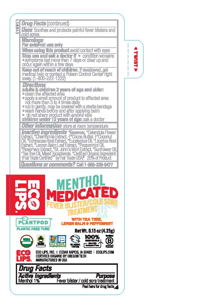 This is a text for a 100 percent plant-based organic lip balm from Ecolips, Inc. that is medicated to soothe and protect painful fever blisters and cold sores. The active ingredient in the balm is menthol and the product contains certified organic ingredients. The balm is applied to the affected area up to four times daily for adults and children over two years old. The inactive ingredient list includes natural extracts, organic ingredients, and mixed tocopherols, and the product is stored at room temperature. The packaging is eco-friendly and recyclable. It comes in 0.15 oz (4.25g) packaging.*