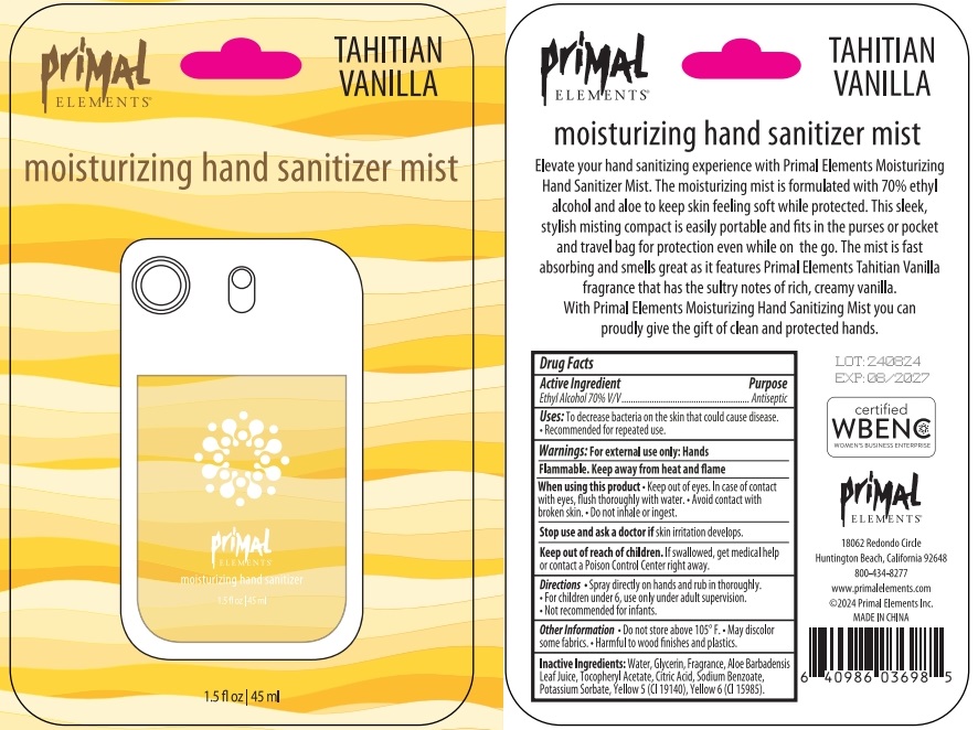 The following image provide visual information about the product associated with Primal Elements Moisturizing Hand Sanitizer Mist - Tahitian Vanilla NDC 75262-013 by Zhejiang Eshine Cosmetic Co Ltd, such as packaging, labeling, and the appearance of the drug itself. This resource could be helpful for medical professionals, pharmacists, and patients seeking to verify medication information and ensure they have the correct product.