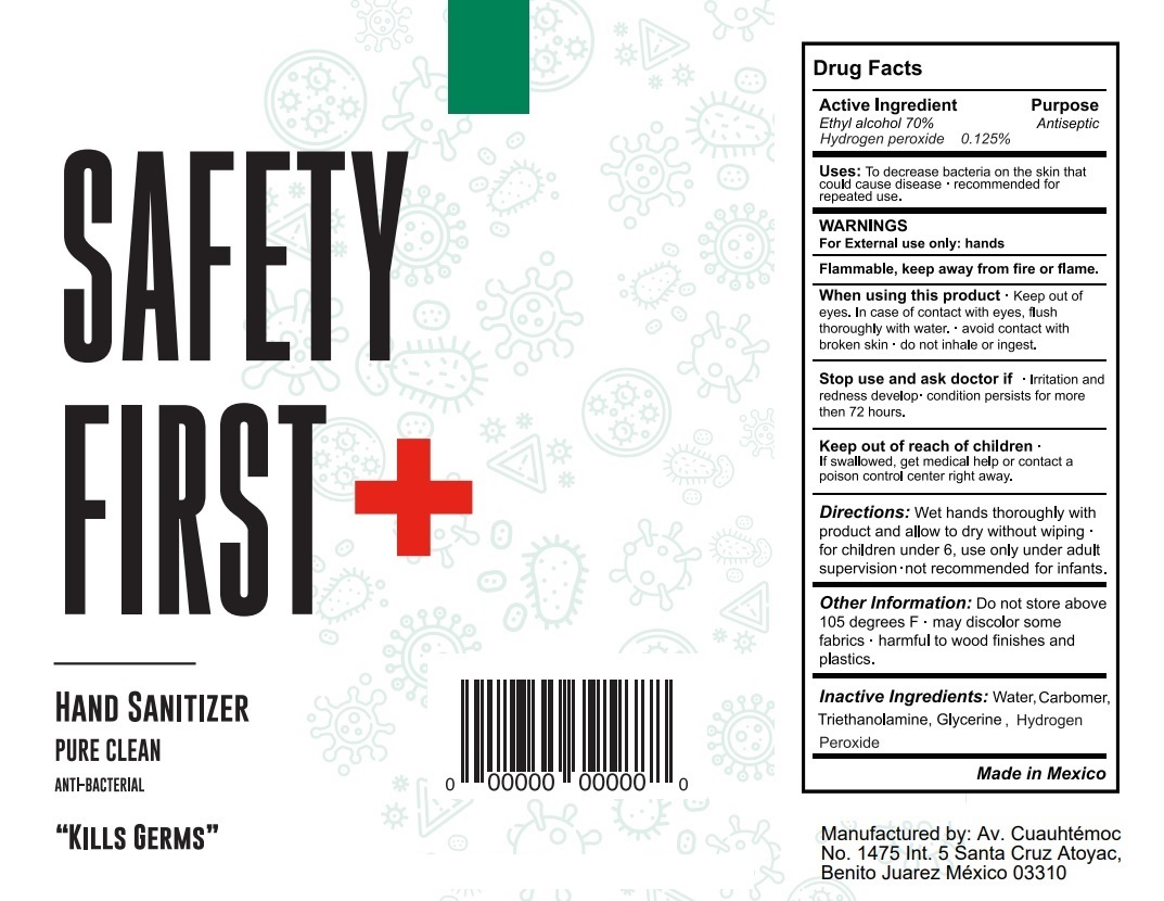 This is a drug facts label for a hand sanitizer product that contains 70% ethyl alcohol and 0.125% hydrogen peroxide. The product is recommended for decreasing bacteria on skin that could cause disease, but users are warned to keep the product away from fire and not to ingest or inhale it. The product is not recommended for infants and may discolor some fabrics and harm wood finishes and plastics. The product is made in Mexico and manufactured by Av. Cuauhtémoc.*