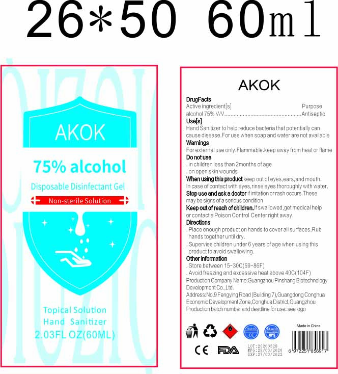 Description: This is a disposable disinfectant gel that acts as a hand sanitizer. It contains 75% alcohol and is 2.03FL OZ in size (60ML). The text includes warnings to keep away from flames and heat and the instruction to stop using the product and ask a doctor if there are signs of a serious condition. The product address is mentioned as No.9 Fenyng Roat, and the city appears to be Angdong Conghua in Angzhou.*