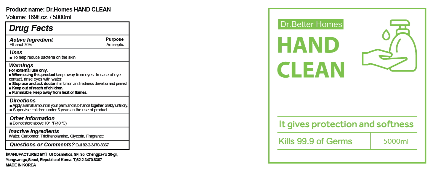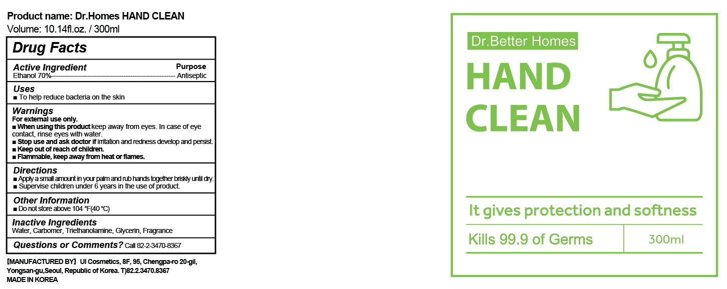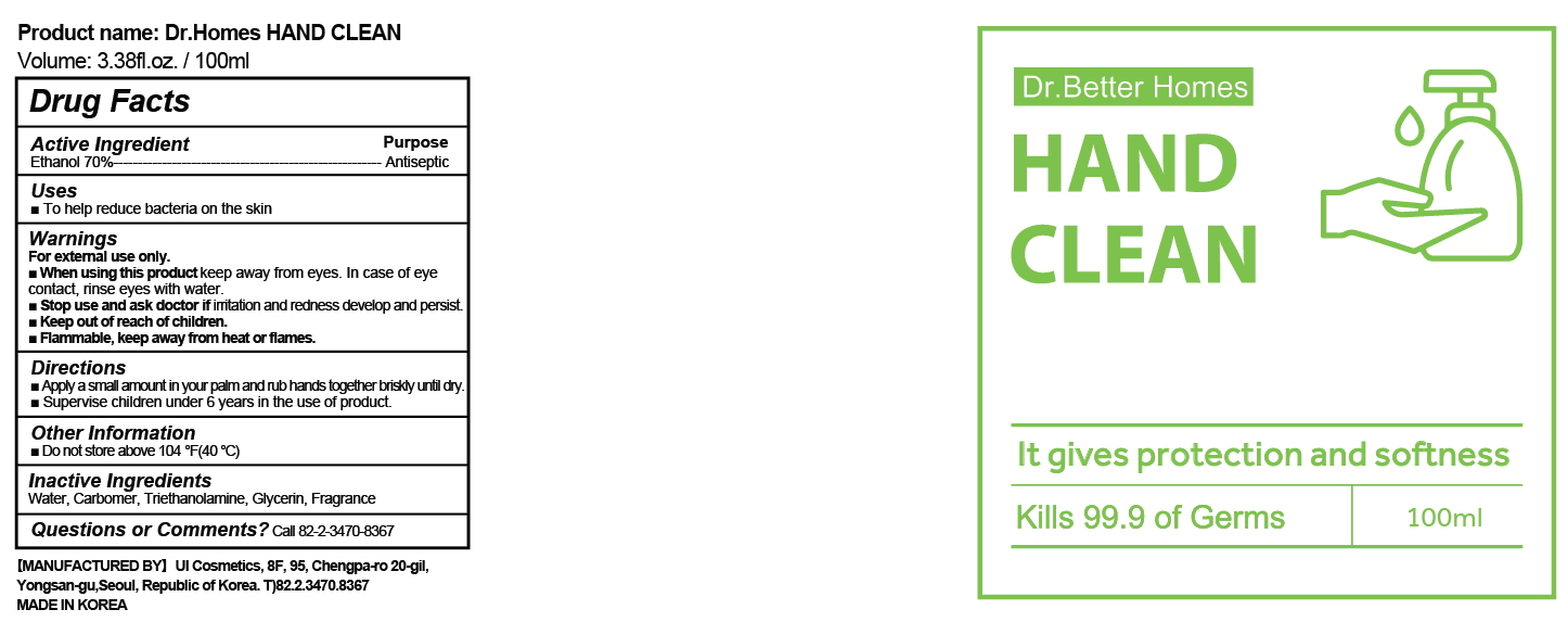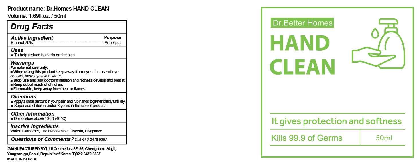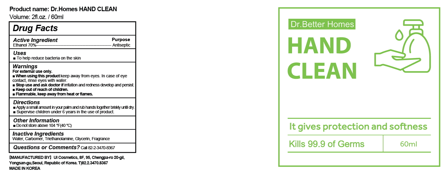Dr. Homes HAND CLEAN is a hand sanitizer that contains 70% Ethanol and has a volume of 1.69fl.oz./50ml. The purpose of this product is to reduce bacteria on the skin. It should be used externally only, and contact with eyes should be avoided. In case of eye contact, rinse with water. Children under the age of six should be supervised while using this product. The product contains water, carbomer, triethanolamine, glycerin, and fragrance as inactive ingredients. It is manufactured by UI Cosmetics in Korea and can be contacted at 82-2-3470-8367.*