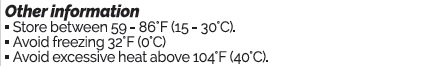 This text provides instructions for storing a product within a specific temperature range. It advises storing the product between 59 - 86F (15 - 30°C) and avoiding freezing at 32°F (0°C). Additionally, it warns against exposing the product to excessive heat above 104°F (40°C).*