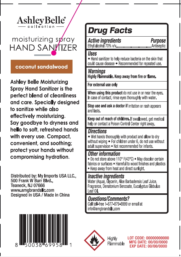 Ashley Belle Moisturizing Spray Hand Sanitizer in coconut sandalwood scent offers a perfect balance of cleanliness and nourishment. This convenient product is designed to sanitize effectively while also moisturizing the skin, leaving hands soft and refreshed. With 70% ethyl alcohol as the active ingredient, this hand sanitizer is recommended for repeated use to help reduce bacteria on the skin. It is compact and soothing, making it ideal for on-the-go protection without compromising hydration. This product is distributed by My Imports USA LLC and made in China. For more information or questions, you can contact them at [email protected] or 1-677-876-6999. The bottle includes important details like lot code, manufacturing date, and flammability warning.*