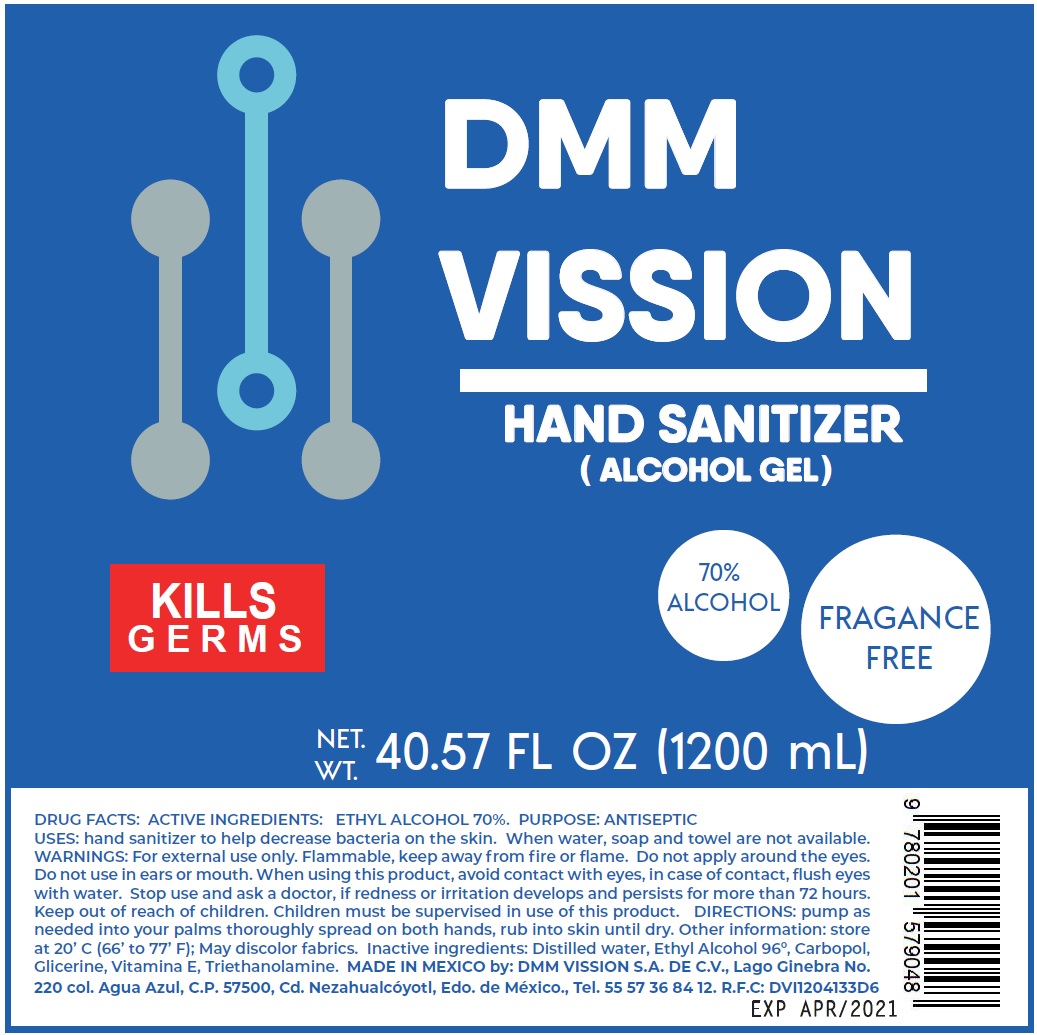 DMM VISSION HAND SANITIZER is a fragrance-free antiseptic product used to reduce bacteria on the skin. It contains an active ingredient called Ethyl Alcohol, 70% which is responsible for its effectiveness. It is designed to be used when soap, water, and towel are not available. However, it should not be applied around the eyes, ears or mouth. In case of irritation, discontinue use and consult a doctor. The product should be kept at 20'C (66' to 77'F) and away from fire or flame. Its inactive ingredients are distilled water, Ethyl Alcohol 96°, Carbopol, Glycerine, Vitamin E, and Triethanolamine. The product is made in Mexico by DMM VISSION S.A. DE C.V. with contact details provided. The product comes in a packaging of 40.57 FL OZ (1200 mL).*
