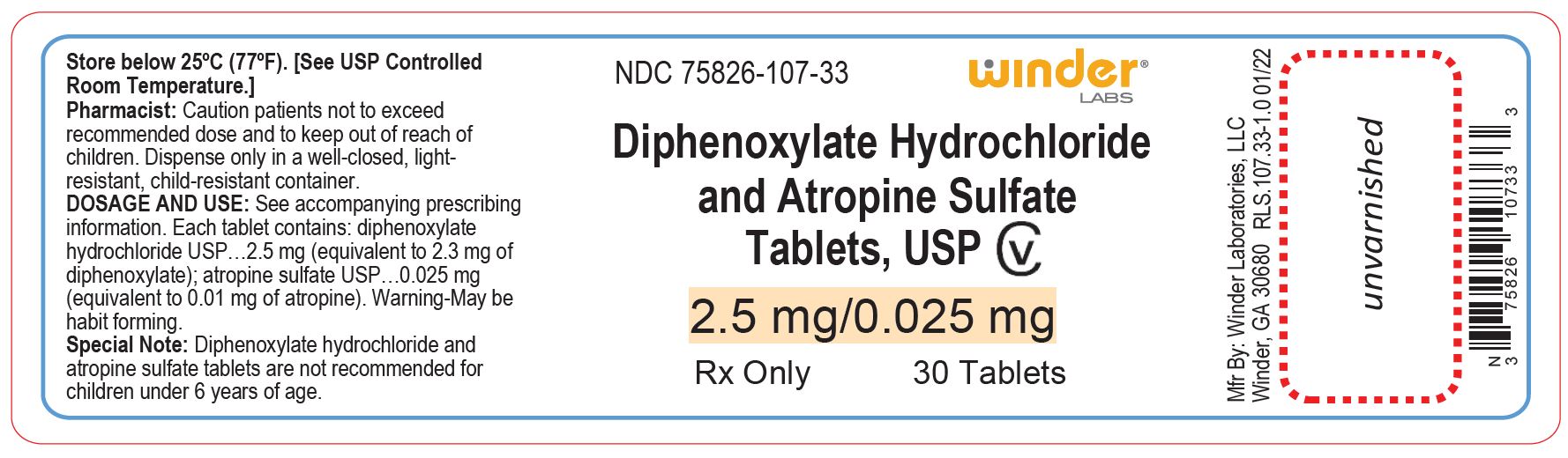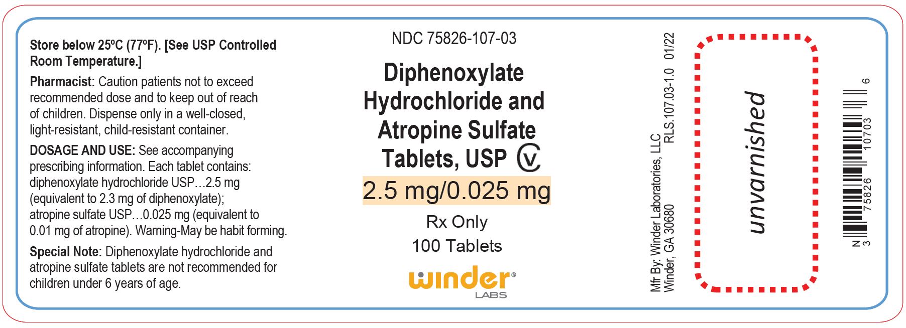 This text provides information about Diphenoxylate Hydrochloride and Atropine Sulfate Tablets, USP, which should be stored below 25°C and dispensed in a well-closed, light-resistant, child-resistant container. The tablets contain 2.5 mg of diphenoxylate hydrochloride USP and 0.025 mg of atropine sulfate USP, which may be habit-forming and are not recommended for children under 6 years of age. The NDC number is 75826-107-90 and the tablets are Rx only. The manufacturer is Winder Laboratories, LLC in Winder, GA 30680. The remaining part of the text contains non-English characters and unreadable text.*