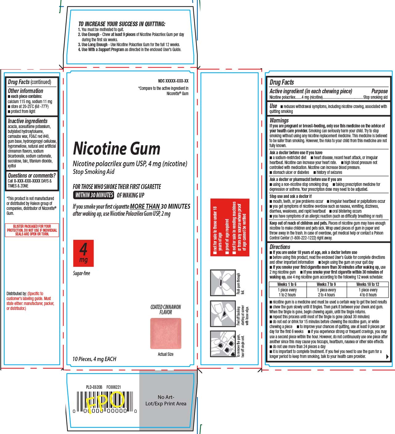 The text contains information about how to increase the success in quitting smoking by using Nicotine Polacrilex Gum. It provides guidelines on dosages, duration of use, and the importance of following a support program. The text also includes warnings about the risks and proper usage of the gum, along with instructions on when and how to use the gum for optimal results. Additionally, it offers advice on managing cravings and possible side effects. For any concerns or questions, users are advised to contact a doctor or pharmacist.*
