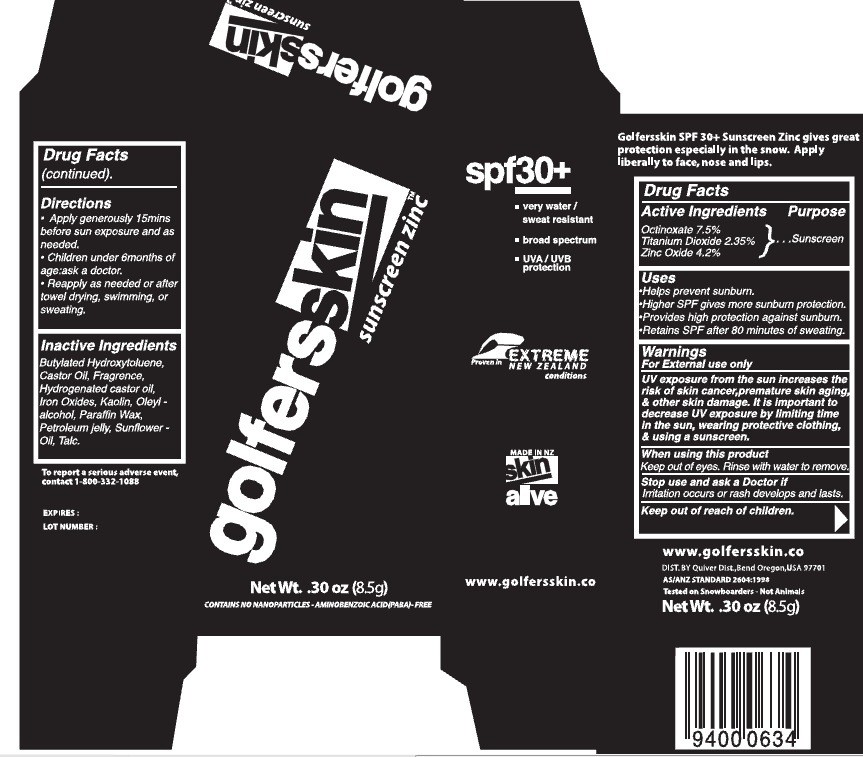 Golferskin SPF 30+ Sunscreen Zinc provides effective sun protection suitable for use even in snowy conditions. The sunscreen should be applied in sufficient quantity to cover the face, lips, and nose. The provided drug facts indicate that it is a SPF30+ sunscreen. No further details are available as the text mostly contain symbols and random characters.*
