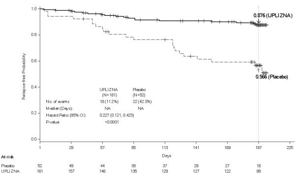 The time to the first adjudicated relapse was significantly longer in patients treated with UPLIZNA compared to patients who received placebo (relative risk reduction 73%; hazard ratio: 0.272; p < 0.0001). In the anti-AQP4 antibody positive population there was a 77.3% relative reduction (hazard ratio: 0.227, p < 0.0001). There was no evidence of a benefit in patients who were anti-AQP4 antibody negative.