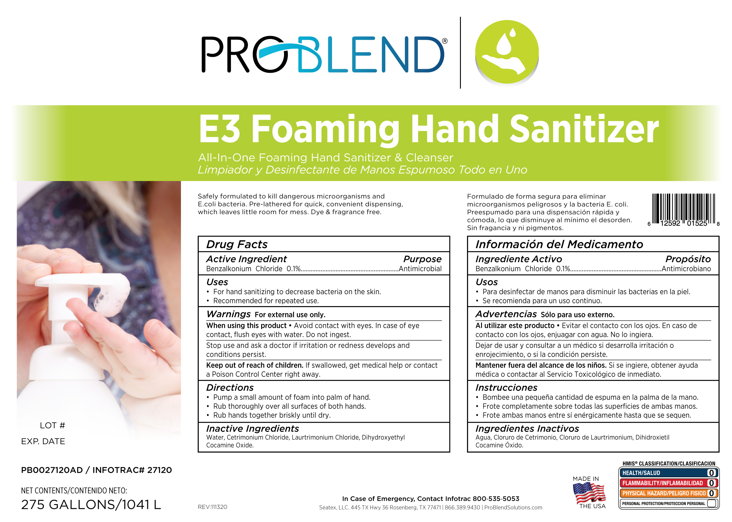 The following 6 images provide visual information about the product associated with Problend E3 Foaming Hand Sanitizer NDC 76250-120 by Seatex, Llc, such as packaging, labeling, and the appearance of the drug itself. This resource could be helpful for medical professionals, pharmacists, and patients seeking to verify medication information and ensure they have the correct product.