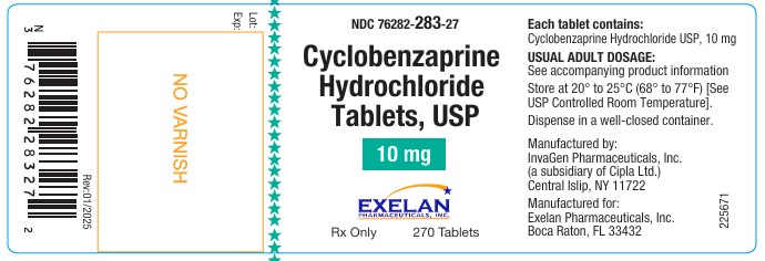 The text provides information about a medication with the NDC 76282-283-27. Each tablet contains 10 mg of Cyclobenzaprine Hydrochloride USP. The tablets should be stored at controlled room temperature. They are manufactured by InvaGen Pharmaceuticals. More details can be found in the accompanying product information.*