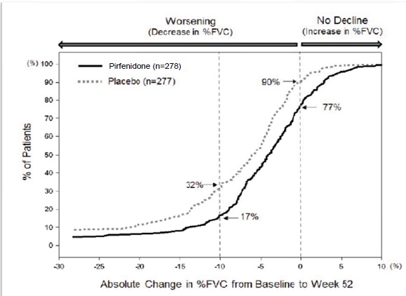 This is a table that compares the absolute change in %FVC (Forced Vital Capacity) from baseline to week 52 between two groups of patients: those who received Pifenidone and those who received a placebo. The percentage of patients who experienced worsening or improvement of %FVC are shown as well. No further information beyond what is presented in the table is available.*