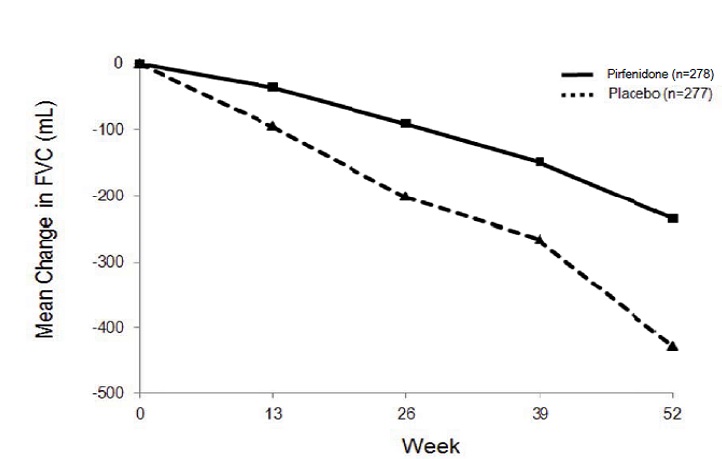 The text is providing data on the mean change in Forced Vital Capacity (FVC) in milliliters after a particular period of time for two groups- one group receiving Piferidone (n=278) and the other group receiving Placebo (n=277). However, the details and context of the study are not available.*