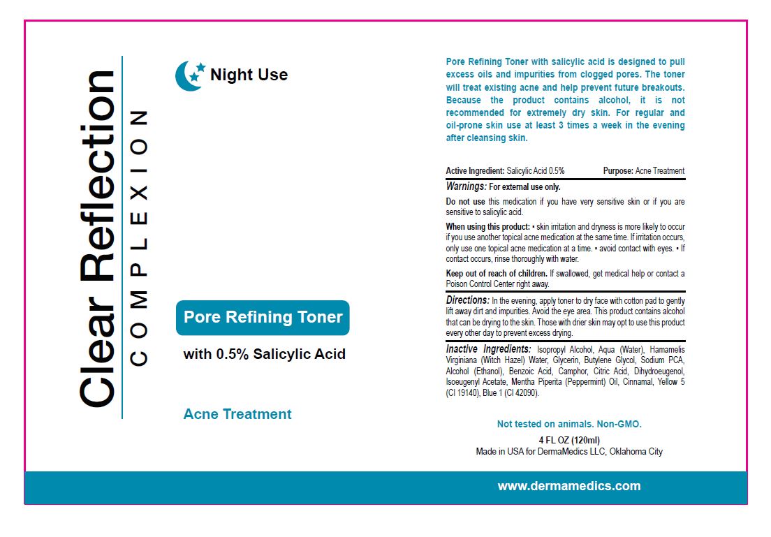 This is a description of a Pore Refining Toner with Salicylic Acid that is designed to treat acne and prevent future breakouts. The toner is recommended for regular and oil-prone skin and contains 0.5% salicylic acid as an active ingredient. The toner should be applied at least three times a week in the evening after cleansing the skin. The toner may cause skin irritation and dryness if used with other topical acne medications at the same time, and users should avoid contact with their eyes. The toner is not recommended for people with very sensitive skin or those who are sensitive to salicylic acid. The product is not suitable for extremely dry skin due to the presence of alcohol. The toner comes with a set of instructions and includes inactive ingredients like isopropyl alcohol, water, witch hazel water, glycerin, and others. The product is made in the USA and the parent company is Dermamedics LLC, Oklahoma City.*